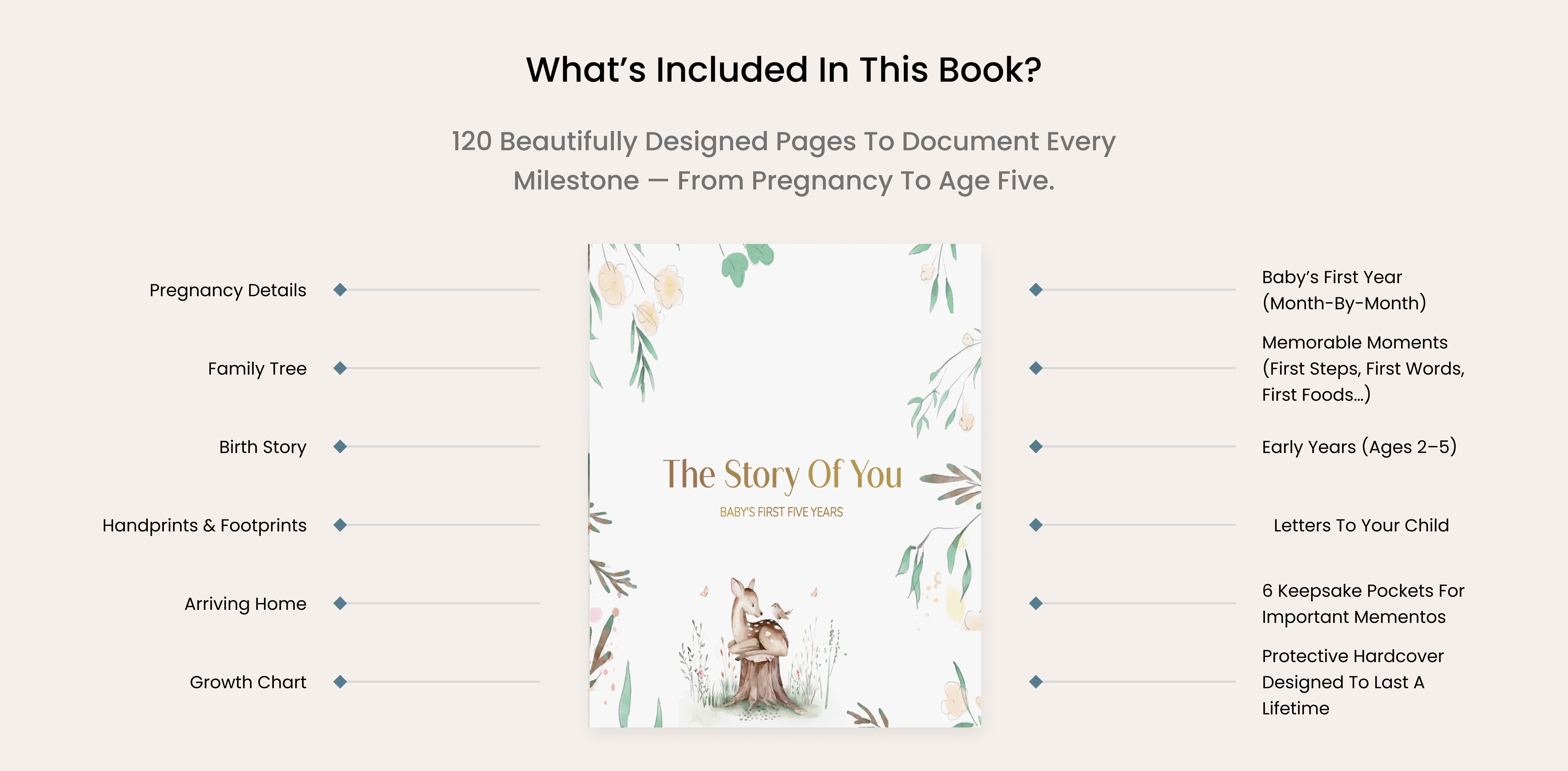 Our book is crafted to last a lifetime as a family heirloom. It covers the first five years of your baby's journey with guided prompts, beautiful illustrations, and high-quality, durable pages that won’t fade or tear. It’s designed to be simple, emotionally resonant, and stress-free to fill out.