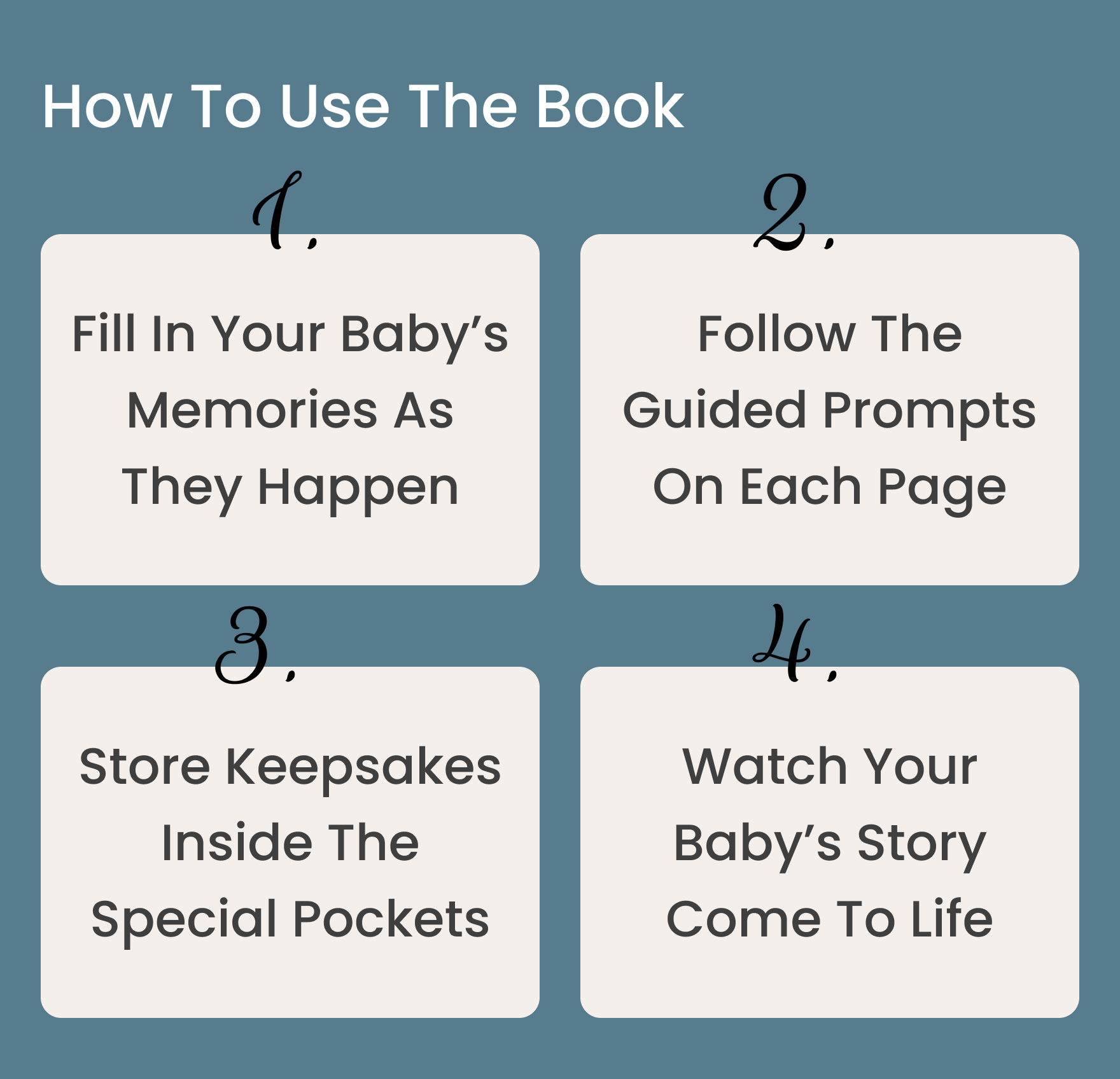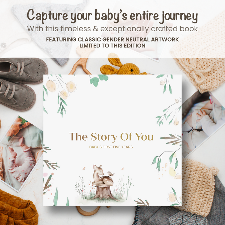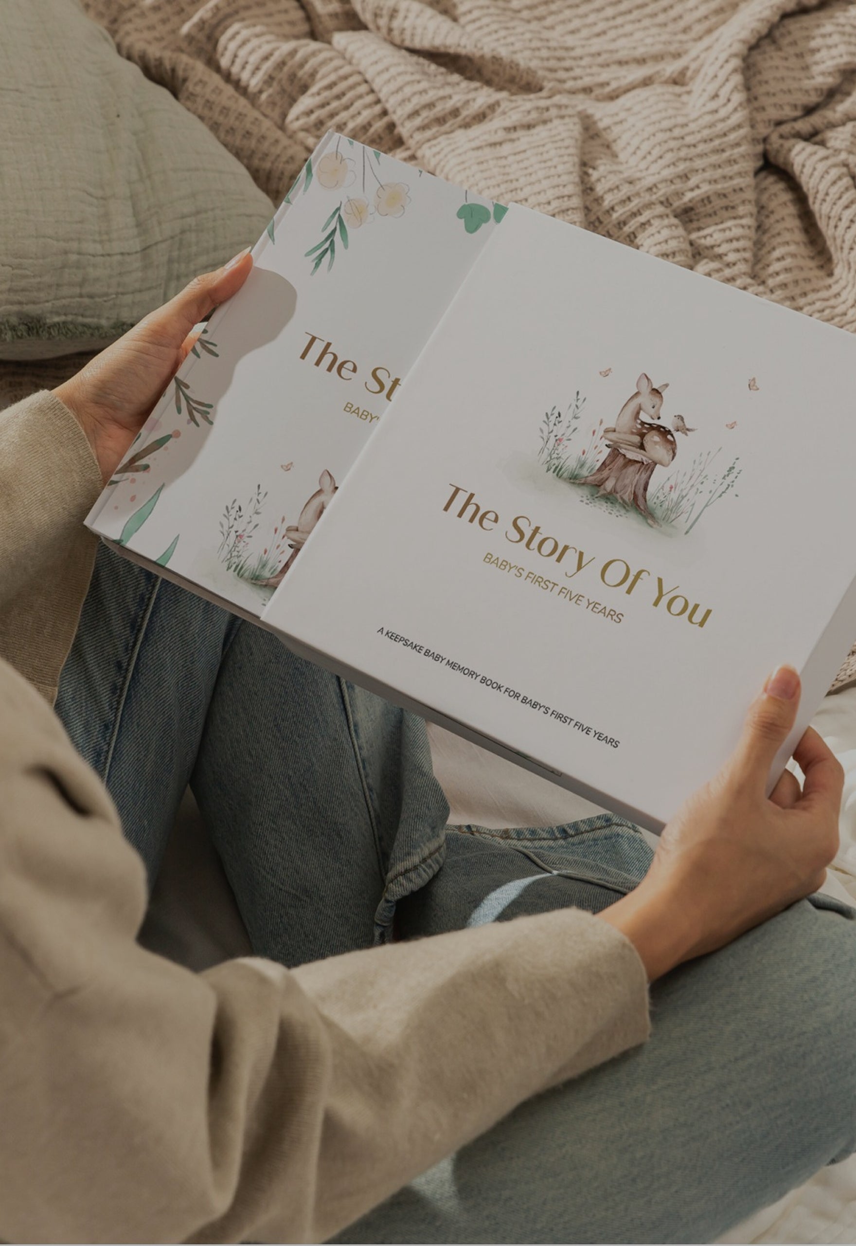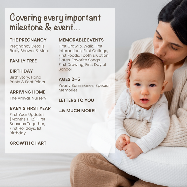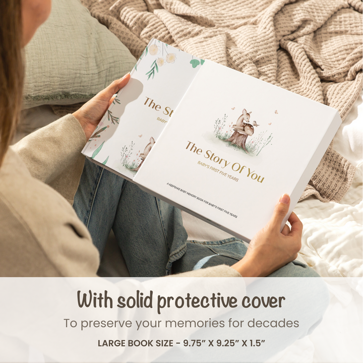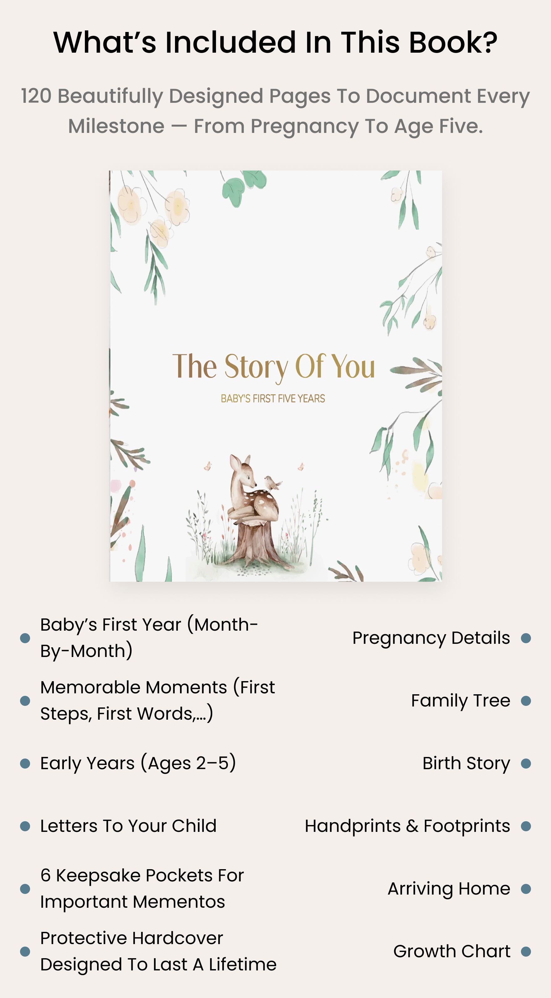 Our book is crafted to last a lifetime as a family heirloom. It covers the first five years of your baby's journey with guided prompts, beautiful illustrations, and high-quality, durable pages that won’t fade or tear. It’s designed to be simple, emotionally resonant, and stress-free to fill out.